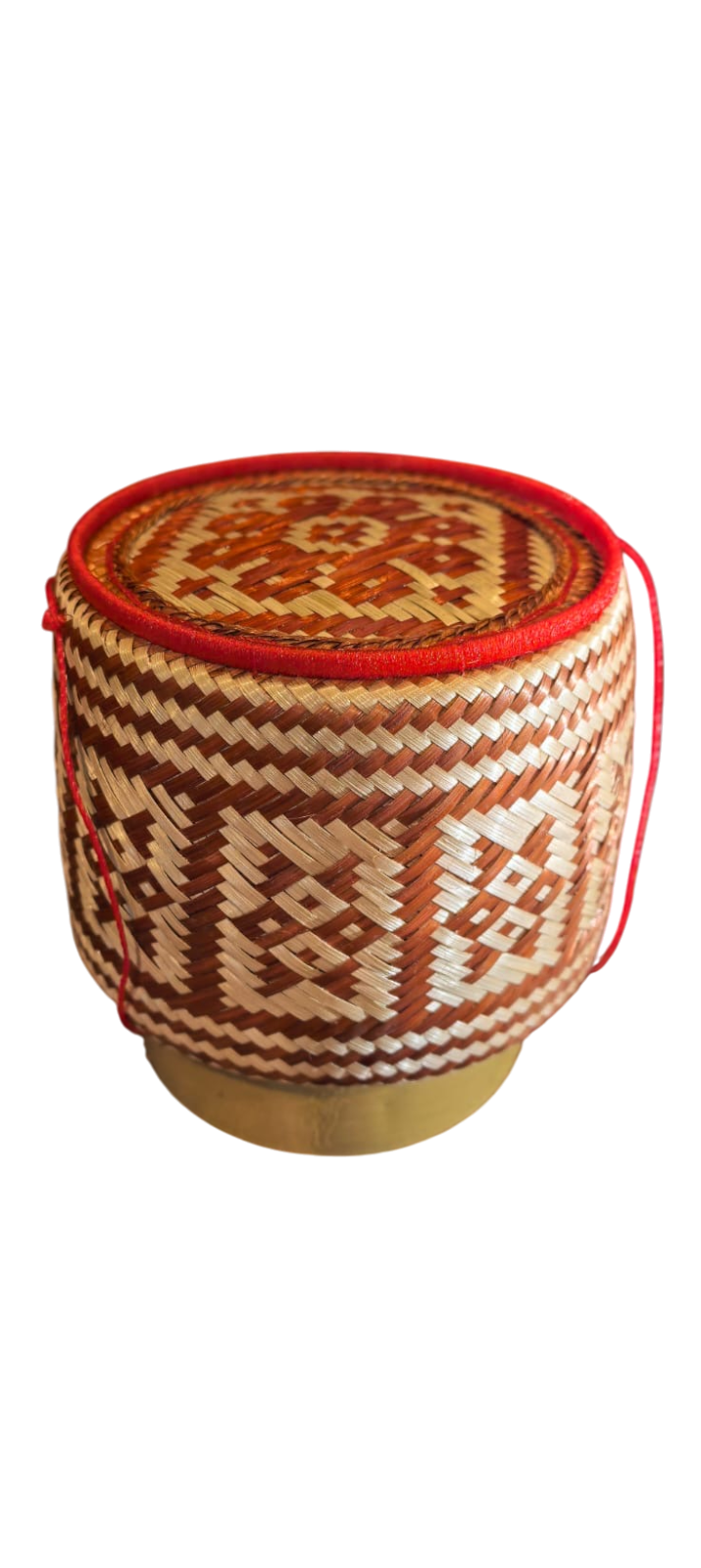 This traditional Thai sticky rice basket is handcrafted in Thailand using 100% natural bamboo and authentic weaving techniques. This variation features a distinctive star-floral geometric motif on the lid, combined with a structured diamond band pattern around the body.