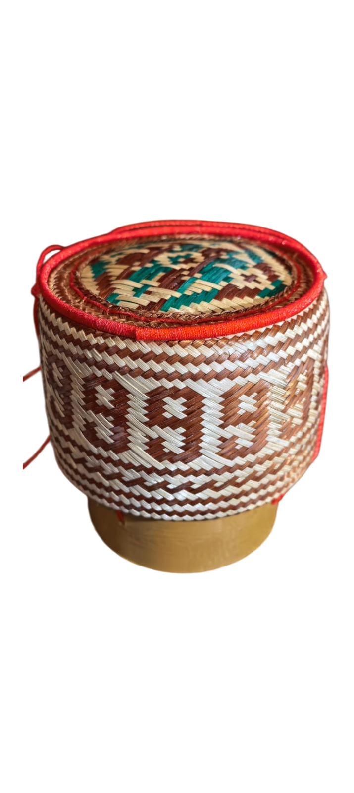 This traditional Thai sticky rice basket is handcrafted in Thailand using 100% natural bamboo and traditional weaving techniques. This variation features a distinctive diamond cross geometric pattern, combined with a decorative colored top design and reinforced red edging.